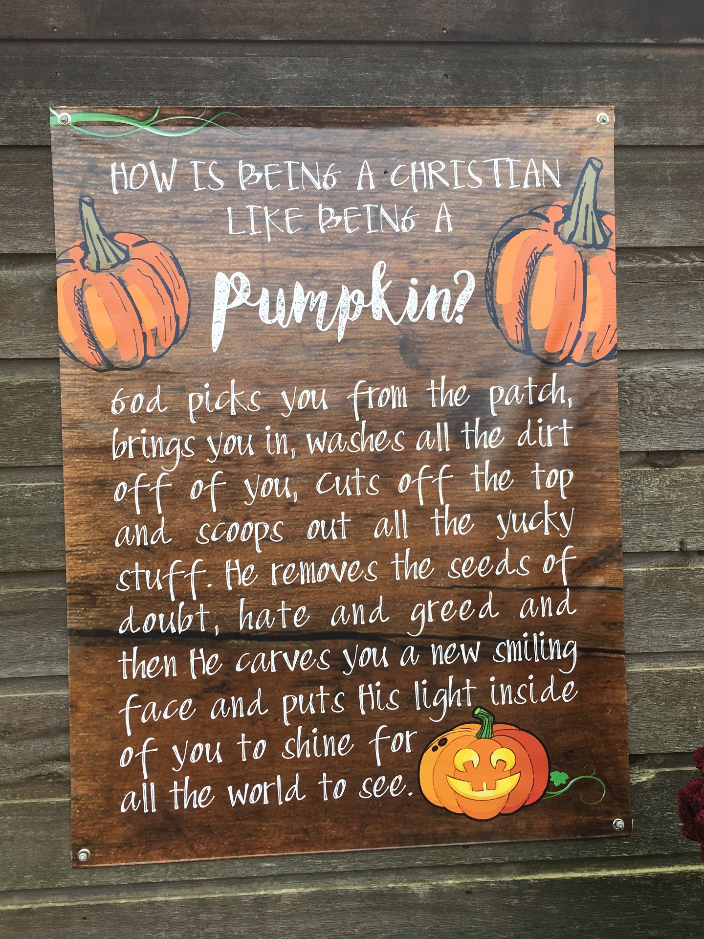 "How is being a Christian like being a pumpkin? God picks you from the patch, brings you in, washes all the dirt off of you, cuts off the top and scoops out all the yucky stuff. He removes the seeds of doubt, hate and greed and then He carves you a new smiling face and put His light inside of you to shine for all the world to see." 🎃